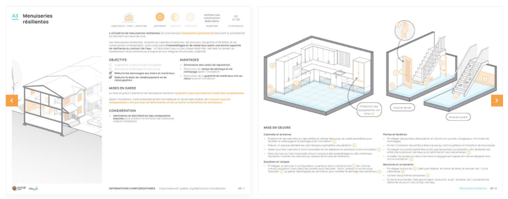 « Les fiches Habitations + Inondations : Mesures d’adaptation résidentielle sont conçues pour accompagner les propriétaires, les professionnel.le.s du bâtiment et autres parties prenantes lors de la préparation de travaux préventifs ou lors de la reconstruction suite à un sinistre lié à l’eau. Elles sont également une ressource pour les gouvernements locaux désireux de promouvoir des stratégies complémentaires ou des alternatives aux initiatives de protection des zones inondables déjà en place ou à la relocalisation des bâtiments exposés aux risques d’inondations urbaines, par embâcle ou en eau libre. »